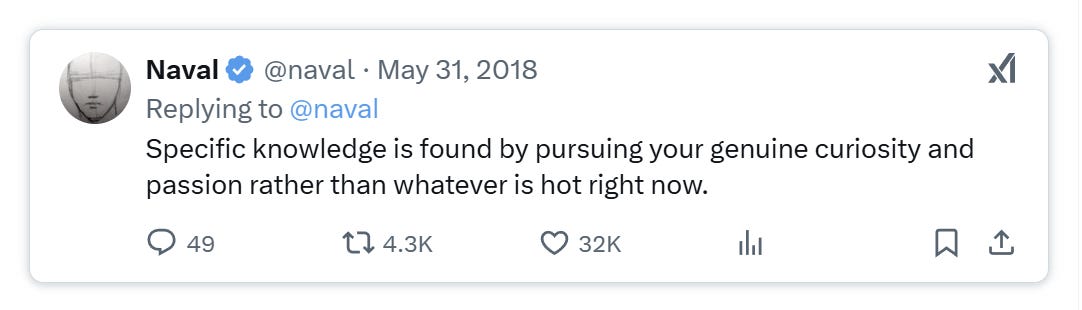 Naval says you need specific knowledge. Specific knowledge is the knowledge that only you have. The easiest way to create this is to have a personal brand. As I mentioned earlier. People read my thoughts because I am the one writing them.