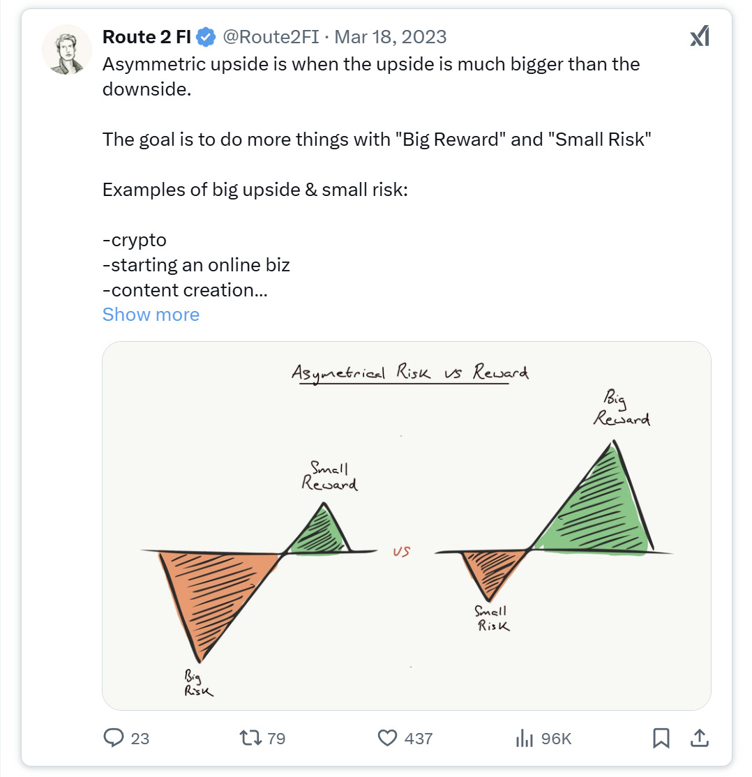 Asymmetrical bets to the upside are bets where the upside nets you 10-100x if you win, but you only lose small if you lose.